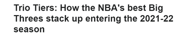 ESPN把爵士、76人和热火的三巨头组合都排在第四档。戈贝尔、康利和米切尔的常规赛表现够犀利,他们需要通过季后赛来证明自己。西蒙斯要是留在76人,他和恩比德、哈里斯的组合又能走多远?并不是那么被看好。至于热火,洛瑞、阿德巴约和巴特勒的组合,有可能在东部制造一些噪音,但他们要想击败雄鹿和篮网,还是颇有难度。