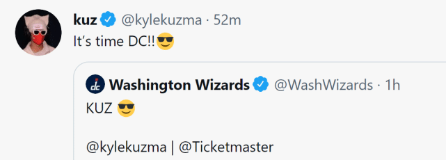 有趣的是丁威迪和波普以相似的发型亮相。两人都是爆炸头,球衣号也和之前一样,没有变化。由于奇才的0号球衣属于阿里纳斯,未来很可能要退役,库兹马改穿33号,拍照时他笑容满面,随后还更新社媒转发自己的照片配文写道:“是时候了,DC!”