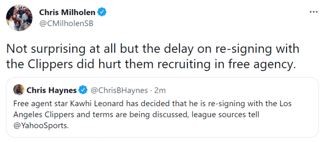 小卡此前拒绝了3600万美元的球员选项,进入自由球员市场。不过,他并没有第一时间和快船完成续约,这一举动,也招致外界的批评。美记克里斯-米尔霍伦在社媒上表示:“(小卡留队)不会令人感到意外,但他推迟和快船续约,确实已经在招募自由球员方面伤害球队了。”他的这一观点,不是第一次被提出。