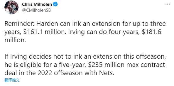 据名记chris Milholen报道,哈登有资格提前续约3年1.61亿美元,欧文有资格提前续约4年1.82亿美元,若三巨头都决定提前续约,他们新合同总额将高达5.4亿美元;若欧文等到明年续约,他可以续签5年2.35亿美元的超级合同。