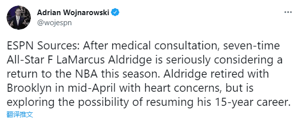 来源:24直播网08-05 09:5224直播网讯 北京时间8月5日,35岁的阿尔德里奇正计划重返NBA,据名记沃纳罗斯基报道,经过医疗咨询之后,七届全明星阿尔德里奇已认真考虑重返NBA;4个月前阿德曾因心脏问题宣布退役,现在他想重返赛场。