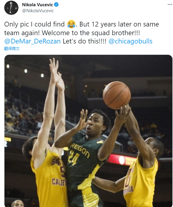武切维奇第一时间欢迎德罗赞,发推写道:我只能找到这张照片,时隔12年又在同一支球队,欢迎小伙伴加入,让我们一起冲冠吧!
