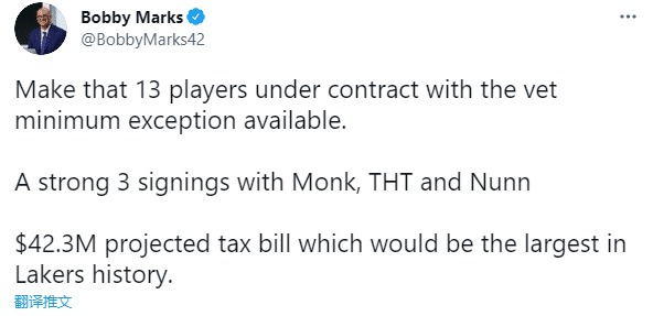 不过薪资专家Bobby Marks报道,湖人队内已经有13名球员,预计将会缴纳4230万美元的税,这是湖人队史最大的税单。