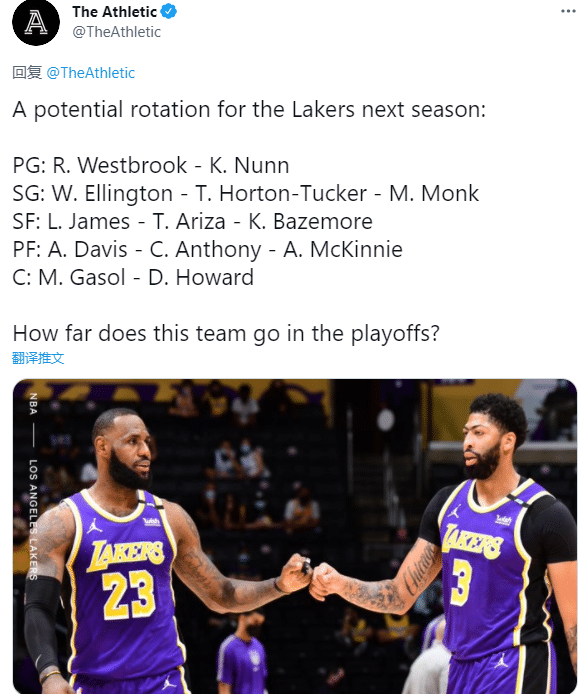 经过这两天疯狂操作,湖人新赛季的核心阵容是控卫威少和纳恩;分卫霍顿-塔克、艾灵顿和蒙克;小前锋詹姆斯、贝兹莫尔;大前锋浓眉、安东尼和阿里扎;中锋霍华德和小加索尔;两名双向合同球员分别是乔尔-阿亚伊和奥斯汀-里维斯;美媒TA发推:湖人这套阵容能在季后赛走多远?