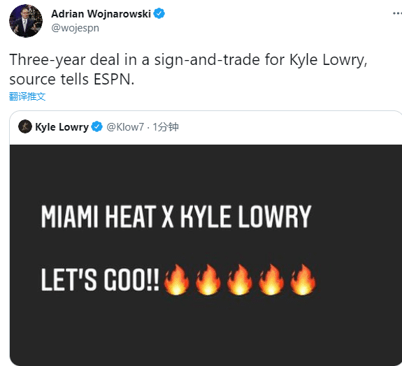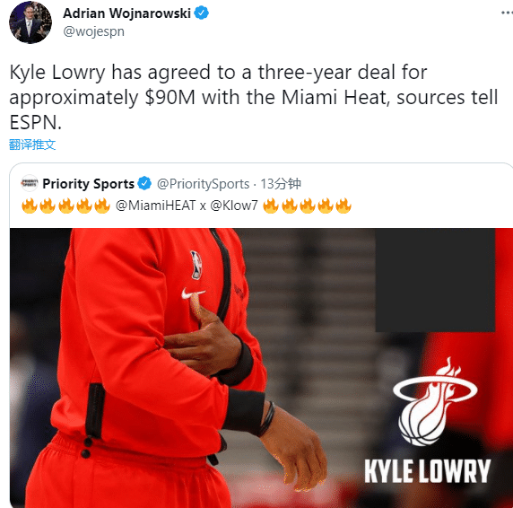 热火通过先签后换的方式引援洛瑞,洛瑞新签一份3年9000万美元合同,之后洛瑞提前宣布加盟热火,发推写道:迈阿密热火X凯尔-洛瑞,我们一起加油!!!