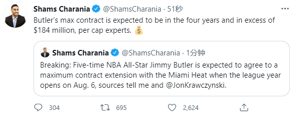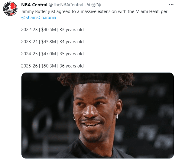 巴特勒和热火提前续签4年1.84亿美元顶薪,巴特勒之前的合同还剩下两年,这份新合同细节曝光,巴特勒最后一年年薪高达5030万美元,22-23赛季4050万美元、23-24赛季4380万美元和24-25赛季4700万美元。
