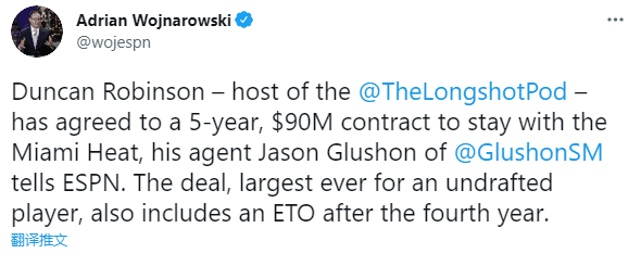 热火和神射手续签5年9000万美元大合同,昔日落选秀拿到生涯第一份大合同,平均年薪1800万美元。