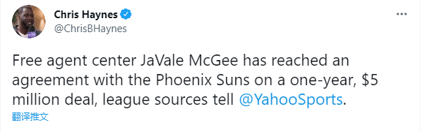 麦基1年500万加盟太阳!三冠中锋驰援保罗:4年1.2亿继续冲冠