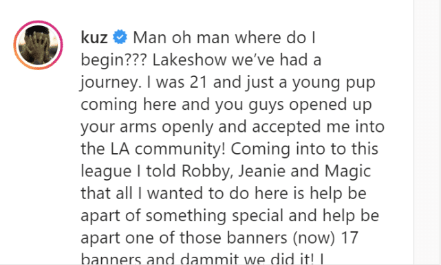 “我该从何说起,湖人秀,我们拥有过一段美好的旅程。当时我还只有21岁,你们张开双臂,欢迎我加入洛杉矶的社区。进入这个联盟时,我告诉罗比(佩林卡)、珍妮(湖人老板)和魔术师,我想做的就是成为这支球队的一部分,帮助球队升起第17面总冠军旗帜,我们做到了!我无法改变任何结果,但不管发生了什么,这都是学习的过程。我从最好的球员那里学到了东西,现在是时候离开了,真正张开我的翅膀,成为我所说的那个人……一日紫金,终身湖人。”