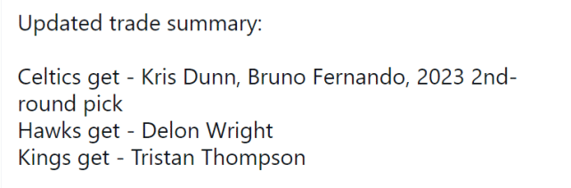 来源:24直播网07-31 09:5924直播网讯 北京时间7月31日,国王、凯尔特人和老鹰正式达成了一笔3队5人交易协议。凯尔特人得到老鹰的后卫克里斯-邓恩、前锋费尔南多、2023年的次轮签(来自老鹰),国王得到凯尔特人的中锋特里斯坦-汤普森,老鹰得到国王的后卫德朗-莱特。