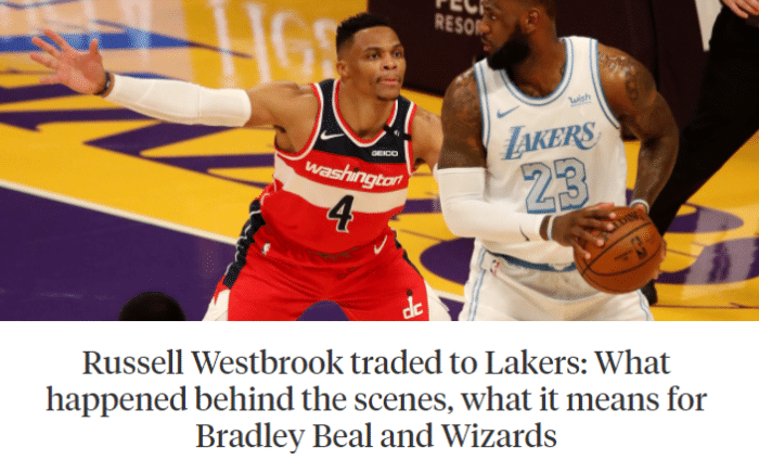 威少不满奇才的操作并且一心想要加盟湖人,而湖人正想引援一位精英级别的控卫,他们认为威少可以胜任这个角色,因此湖人积极推动并且很快就和奇才完成交易;对于威少离队,比尔表示没问题,他会继续留在华盛顿的。