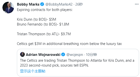 据薪资专家Bobby Marks报道,邓恩下赛季年薪是500万美元,费尔南多180万美元,特里斯坦-汤普森年薪970万美元,因此凯尔特人在交易中可以创造价值700万美元的交易特例。