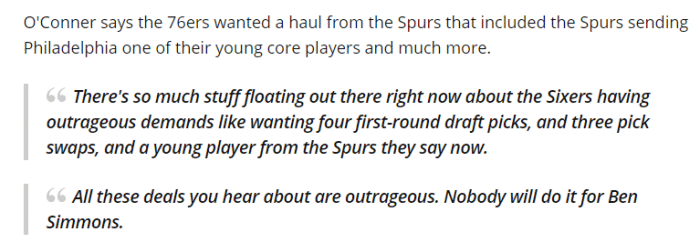 在西蒙斯交易中,76人向马刺索要年轻球员和一系列选秀权,名记沃纳罗斯基表示由于76人要价过高导致关于西蒙斯的交易至今未谈成,他们想要把西蒙斯当成哈登交易,对于这份报价,球迷调侃还以为交易的是恩比德呢。