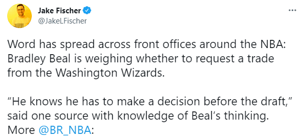 目前比尔正在考路自己的未来,虽然他曾多次公开表态不会离开奇才,但如今关于他计划申请离队的消息已经传开了,名记Jason Dumas跟进报道,若比尔确实申请交易,前往波士顿与好朋友杰森-塔图姆打球并争取总冠军将是他的首选。