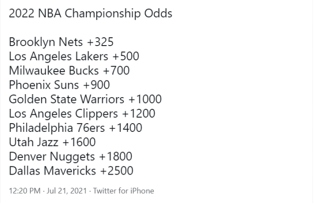 在2021-22赛季的最新夺冠赔率方面,湖人(+500)目前排名第二,仅次于篮网(+325),而刚刚拿到2021年总冠军的雄鹿(+700)位居第三。排名第4-10位的依次是太阳、勇士、快船、费城、爵士、掘金和独行侠。