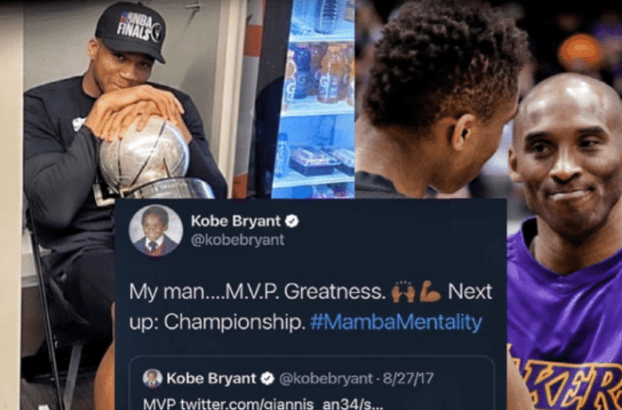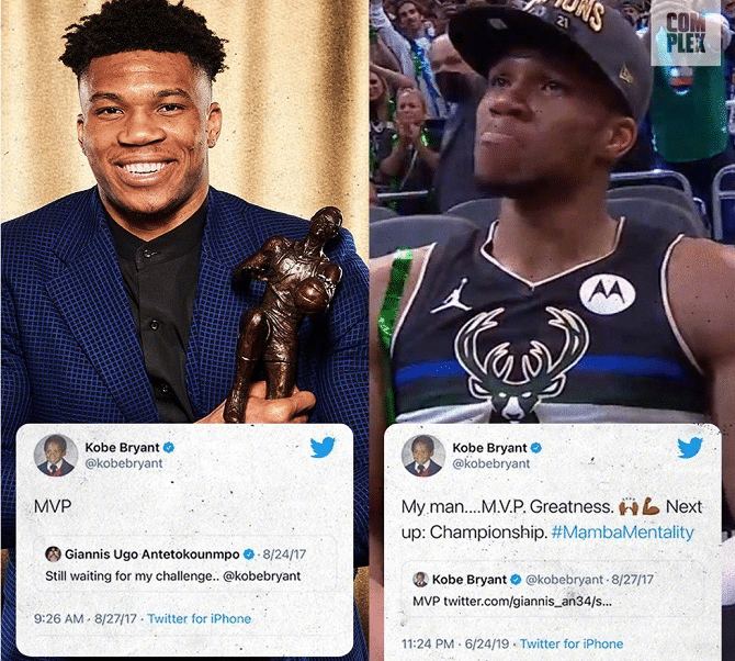 这件事情要从2017年说起,当时的字母哥跟随科比训练,得到了前辈很多的指导。那个时候科比就给字母哥定下了一个目标,就是斩获常规赛MVP,2019年,字母哥做到了,他拿下了个人生涯第一个NBA常规赛MVP的荣誉。科比送上祝福,同时说出了下一个目标,那就是总冠军,言论是“我的兄弟。 MVP。伟大。下一个目标:总冠军”。