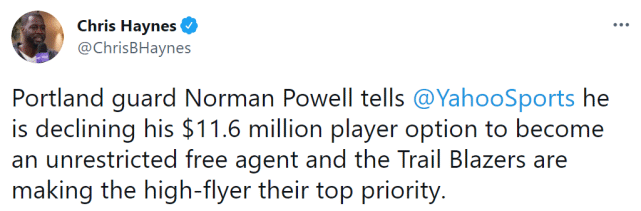 28岁的鲍威尔,将吸引多支球队的追逐,其中也包括开拓者。消息源透露,开拓者已经把续约鲍威尔当作球队休赛期的头号任务。另据NBA记者埃文-马塞报道,在鲍威尔进入自由球员市场后,他的前三选择将是独行侠、尼克斯和开拓者。