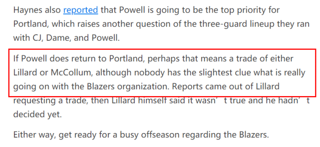 考虑到三后卫阵容的防守问题,美媒认为如果开拓者决定长留鲍威尔,他们未来很可能会发生大交易,送走利拉德和麦科勒姆中的一位。本赛季,开拓者的防守效率排名联盟第29位。