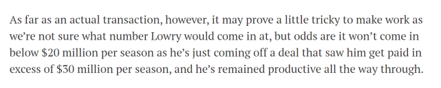 洛瑞本赛季的年薪是3000万美元,美媒认为他的新合同年薪虽然肯定会下降,但预计也不会低于2000万美元。鹈鹕并没有直接签下洛瑞的薪金空间,他们可以寻求先签后换。美媒指出,他们可以通过放走受限自由球员球哥或者哈特,来创造一些薪金空间,交易布莱德索或亚当斯,也能降低球队的薪金开支。