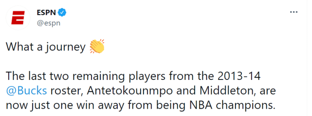 ESPN写道:“多么美妙的旅程!扬尼斯-阿德托昆博和米德尔顿,2013-14赛季雄鹿阵容中依然留队的两位球员,距离NBA总冠军只差一场胜利了。”