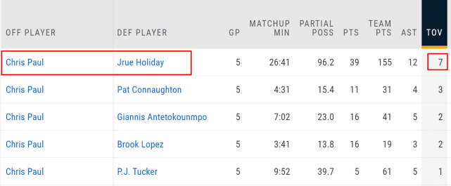 总决赛G1,保罗似乎在延续之前季后赛的势头,轰下32分9助攻,只出现了2次失误。可是剧情在第二场开始改变,总决赛G2,太阳依然获胜,但保罗出现了6次失误,G3是4次失误,G4是5次失误,太阳都输了。他在G5虽然送出11次助攻且只有1次失误,但雄鹿三巨头攻势很猛,联手轰下88分,太阳依然没能赢下比赛。