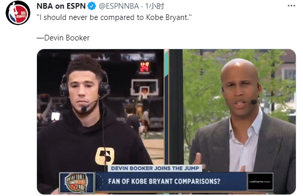 谈到外界拿自己和科比作比较,布克表示:我知道有些人在讨论这个,我自己从来不会做这样的比较,我一直视他为我的导师,我一直在努力追赶他的精神和成就。就我个人而言,我认为我永远都不该和他相提并论。