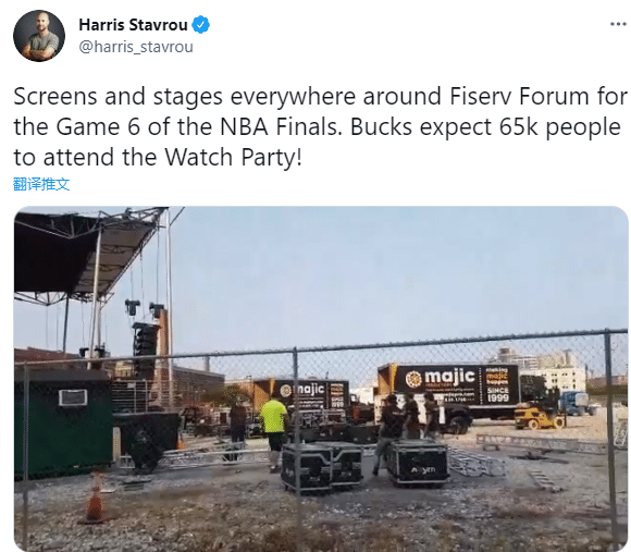 总决赛G5关键一战,字母哥、米德尔顿和霍勒迪三巨头合砍88分攻下天王山,在0-2落后的情况下他们连赢三场从而3-2夺赛点;雄鹿距离夺冠仅差一胜,他们有望G6夺冠,因此雄鹿主场球馆外已经围上围栏,周围布满了舞台和大屏幕,大概能够容纳6.5万人。