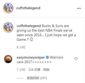 来源:24直播网07-19 18:2024直播网讯 最近杜兰特在互联网上可是非常的忙,前有和网友在语音聊天室中争论,最近杜兰特又和网友在互联网上进行关于总决赛的互动。此前一位网友在互联网上说:今年的NBA总决赛是2016年之后最精彩的总决赛,希望能够打到7场比赛。而杜兰特则在这位网友下面评论道:2017年勇士VS骑士远大于今年。然后该网友回复到:实力悬殊的总决赛应该被自动排除。而杜兰特马上回复到:完全势均力敌的较量,老哥……从上到下都是如此。