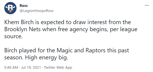 另据美媒LegionHoops的报道,消息源透露,自由球员市场开启后,中锋伯奇会吸引篮网的兴趣。28岁的伯奇本赛季效力过魔术和猛龙,是一个打球很有能量的中锋。效力魔术的48场比赛,伯奇主要打替补,场均5.3分5.1篮板,而效力猛龙的19场比赛,伯奇大部分时间打首发,场均11.9分7.6篮板1.2盖帽。篮网希望在休赛期补强内线,伯奇是他们的潜在选择,他的合同在本赛季结束后到期。