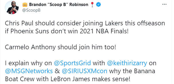 来源:24直播网07-19 17:5124直播网讯 北京时间7月19日,太阳在主场输掉天王山,总决赛大比分2-3落后,在这样的情况下,名记Brandon Robinson言论引热议,他发推写道:如果菲尼克斯太阳没有夺得2021年总冠军,保罗应该考虑在休赛期加盟湖人,安东尼也应该加入他们。
