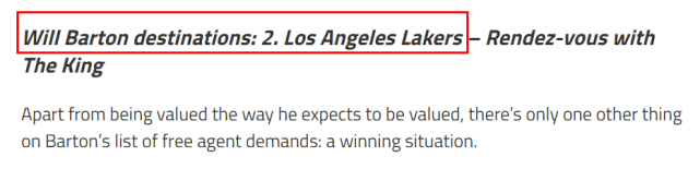 如果巴顿加盟湖人,联手詹姆斯和浓眉,他有能力成为一个替补上的超级得分手,常规赛超过38%的三分命中率也是湖人方面需要的。除了得分,巴顿的组织和防守能力也不错。美媒认为,湖人的薪金空间注定了很难为巴顿提供一份非常大的合同,但到洛杉矶这座城市打球,能让巴顿获得更多的曝光度和更多的场外收入机会。