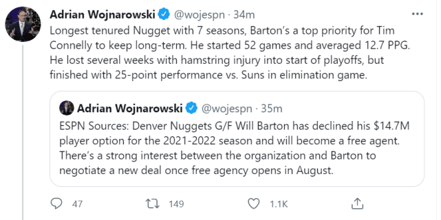 美媒报道称,巴顿期待自己能够得到一份和作用相匹配的报价,与此同时,他也想在一支能赢球的球队里效力。掘金和巴顿都有意续约,但双方毕竟还没正式签下合同,美媒列出了巴顿的五大下家,除了掘金,上面还有湖人、尼克斯、独行侠和灰熊。