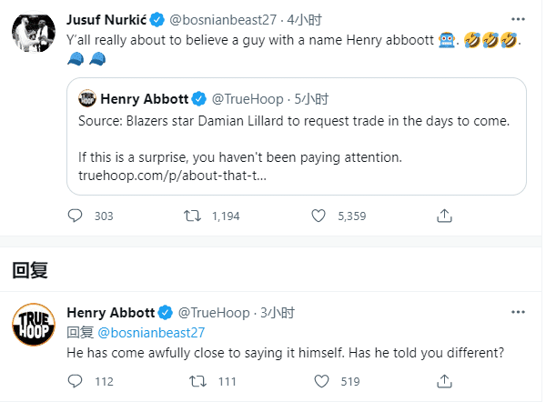 努尔基奇回应美记者Henry Abbott:你们居然相信一个叫Henry Abbott的人(配上笑哭和爱撒谎的表情);之后该记者回应:利拉德已经接近自己说出来了,他告诉你什么不一样的说法了吗?
