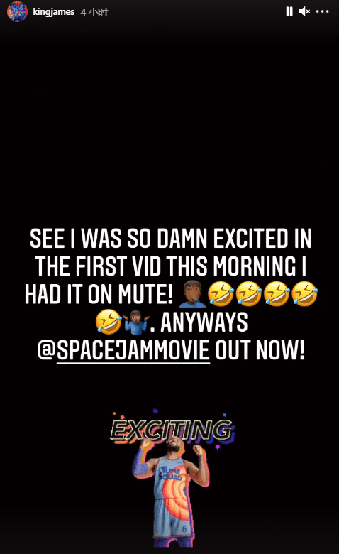 在自拍视频中,詹姆斯说道:今天,我真的有一部电影要上映了,《空中大灌篮之新传奇》。我的天呀!这件事终于击中了我。我不敢相信,我感觉太荣幸了,太受宠若惊了,这很疯狂,我今天真是活力四射,现在我就是超级兴奋,我现在都无法控制我自己。