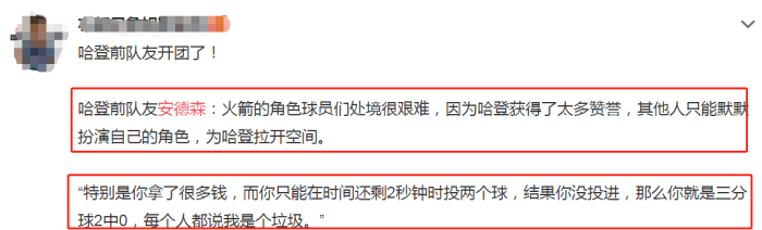 而安德森谈到哈登时,这番话非常犀利,点评了大大胡子的打法,可谓一针见血。“哈登得到了太多称赞,火箭角色球员处境很艰难,其他人只能默默扮演自己的角色,为哈登拉开空间”。