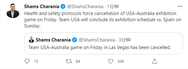 名记shams也报道美国男篮和澳大利亚的这场热身赛被取消,防疫协议导致这场比赛被取消,美国男篮将在下周一对阵西班牙。