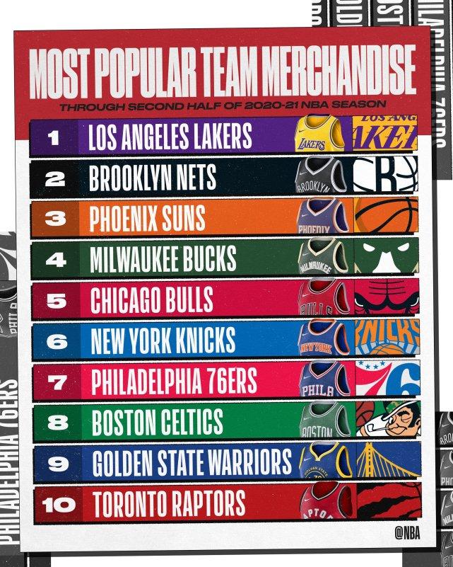 下半季的球队产品销量排名如下:1.湖人、2.篮网、3.太阳、4.雄鹿、5.公牛、6.尼克斯、7.费城、8.凯尔特人、9.勇士、10.猛龙。