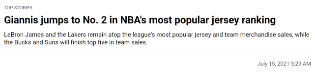 官网数据显示,雄鹿的字母哥下半季球衣销量排名第2,比上半季提升了三位,超过了上半季在他前面的东契奇(2)、杜兰特(3)和库里(4),追平自己的球衣销量排名最高纪录。太阳的布克下半季球衣销量排名第6,创个人球衣销量排名最高纪录,上半季,他的球衣销量只排在第18位。