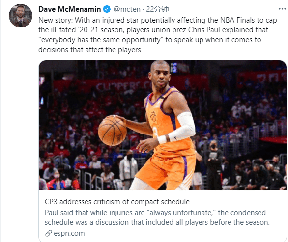 不过说实在的,今年季后赛伤病太多了——浓眉、哈登、欧文、小卡、杰伦-布朗、字母哥等球星都遭遇伤病,但伤病也是比赛的一部分,太阳和雄鹿相遇总决赛,你觉得36岁保罗能在今年如愿夺冠吗?