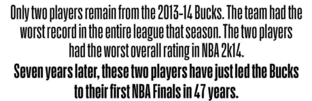 7年,足以让一切改变。字母哥,这位2K数值曾经只有60分的菜鸟,如今已经连续两年夺得常规赛MVP,现在有机会去竞争一座总冠军奖杯。米德尔顿,这位一度不被看好的次轮秀,在季后赛的关键时刻屡屡发威,也成长为全明星级别的球员。两人一起率领雄鹿重返总决赛舞台,而雄鹿上一次打进总决赛已经要追溯到47年前。