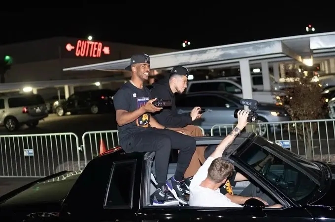 太阳球迷已经很久没有享受这一时刻了,所以在众将返回后一群球迷接机,街道中不少球迷等待迎接他们的英雄,球员们也高举西部冠军奖杯与球迷们一起庆祝。保罗和布克并排坐在一辆敞篷车车顶,绽放着笑容,与球迷打招呼,看起来非常开心!
