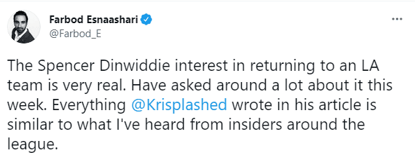 据此前报道,湖人和快船都有兴趣引援丁威迪,而且丁威迪也想为家乡球队效力,不久前快船记者Farbod Esnaashari报道,丁威迪很想为洛杉矶的球队效力。
