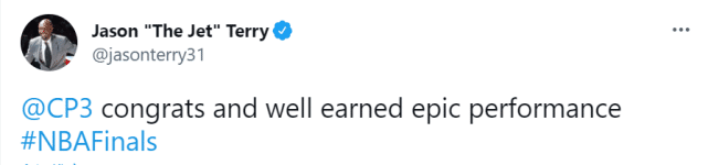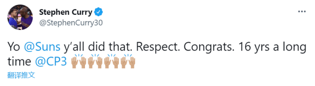 在了解保罗的生涯和目睹保罗在西部冠军颁奖仪式上的动情后,不少NBA球员纷纷发文向保罗送上祝福,库里就说道:“太阳队做到了!致敬!恭喜!16年了,@保罗”,此外,莫兰特、特里、小托马斯等球员也纷纷送上祝福。