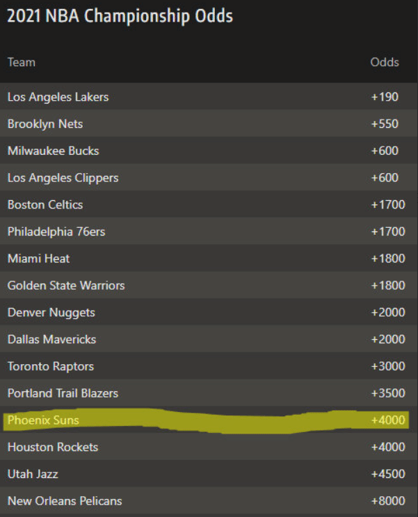 赛季开始前,相关方面曾做了本赛季的夺冠预测。当时的预测结果显示,太阳仅仅是+4000!这一数字排名NBA的第12位,可以说基本被认为无法夺冠。这样的预测合情合理,保罗虽然到队,但太阳已经连续10年无缘季后赛,谁能想到他们能进总决赛呢?