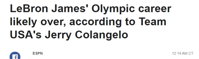 来源:24直播网07-01 15:1324直播网讯美国男篮的球迷,应该不会再看到詹姆斯身穿国家队的球衣了。北京时间7月1日,美国男篮的主管杰里-科朗吉洛在接受采访时透露,詹姆斯的国家队生涯很可能已经结束了。
