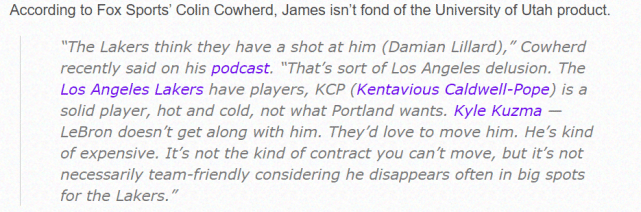 不过,不占优并不代表着没希望。福克斯体育的名嘴Colin Cowherd在节目中谈到了这个话题,他说:“湖人队认为他们有机会得到利拉德。这可能是他们的错觉,波普是一个很不错的球员,但他的手感忽热忽冷,不是开拓者想要的。库兹马不适合詹姆斯,湖人也很想送走他。这不是那种不能送走的合同,但考虑到他也经常在比赛中隐身,未必有吸引力。”