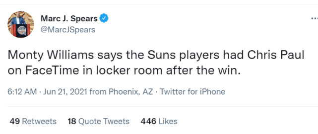 太阳主帅蒙蒂-威廉姆斯赛后也透露,保罗在更衣室里和队友们进行视频连线,为大家拿下西决开门红而兴奋不已。