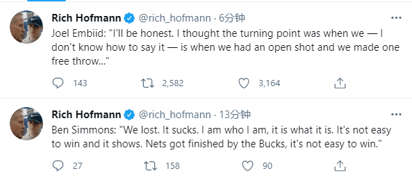 费城输球赛后,恩比德指责西蒙斯末节不敢进攻,他表示:老实说,我想比赛的转折点是当我们有一个空位投篮时,我们却只获得一个罚球。