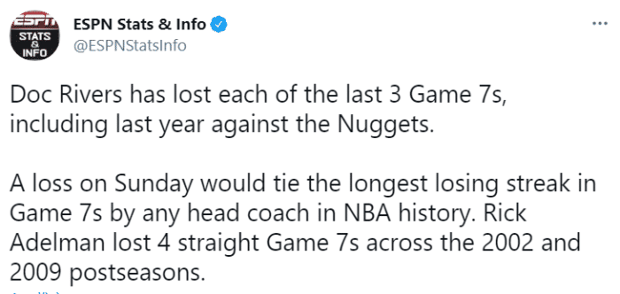 来源:24直播网06-21 10:3124直播网讯 北京时间6月21日,NBA东部半决赛费城和老鹰迎来最后的抢七。赛前,ESPN统计了一项数据,让费城主帅里弗斯比较尴尬。根据统计,里弗斯在过往3个抢七中全部败北。而一旦这场继续输球,他将追平NBA历史上抢七最长的4连败,而之前保持这一纪录的是阿德尔曼。
