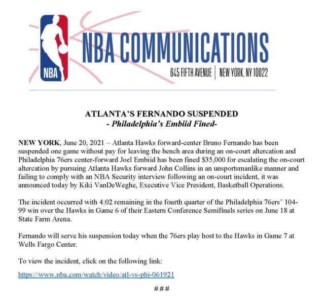 24直播网讯 北京时间6月21日,NBA官方宣布,在东部半决赛的第6场比赛中,费城中锋乔尔-恩比德因为升级了和老鹰前锋科林斯的冲突,遭到35000美元的罚款。